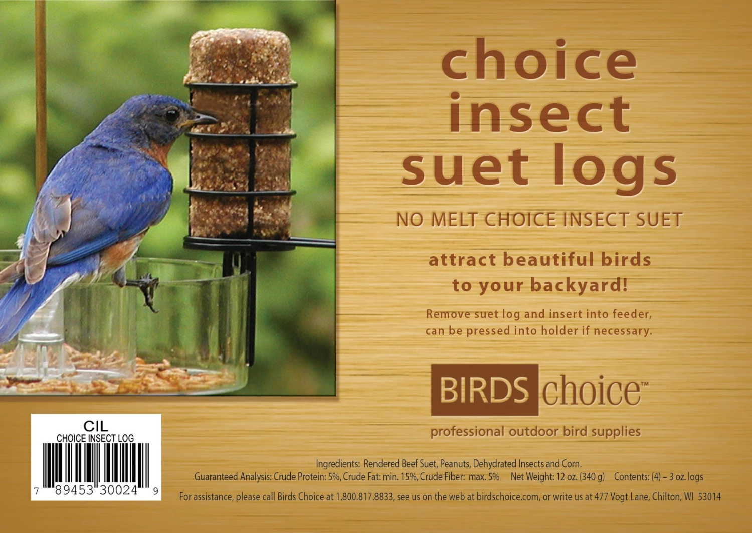 - Ingredients: rendered beef suet, roasted peanuts, dehydrated insects and corn