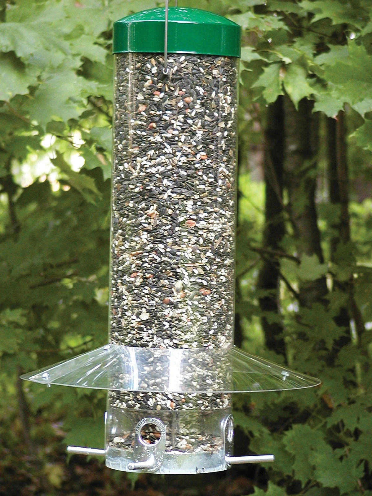 PLEASE NOTE: SMALL VERSION NOT AVAILABLE UNTIL APRIL 1ST. The classic feeder represents the inspiration for every squirrel proof feeder built in the last 20 years and is a handsome addition to any backyard. It features a large seed reservoir made from 6″ diameter UV resistant polycarbonate with baked enamel coating to ensure years of dedicated use. This classic feeder has four aluminum feed ports and perches. Its simple design makes it easy to clean and refill, simply pop the top and pour more seed in. Translucent side panels means that you can quickly see whether the feeder needs to be refilled or not. It holds up to 1.2 or 2.2 gallons of seed. Available in Green