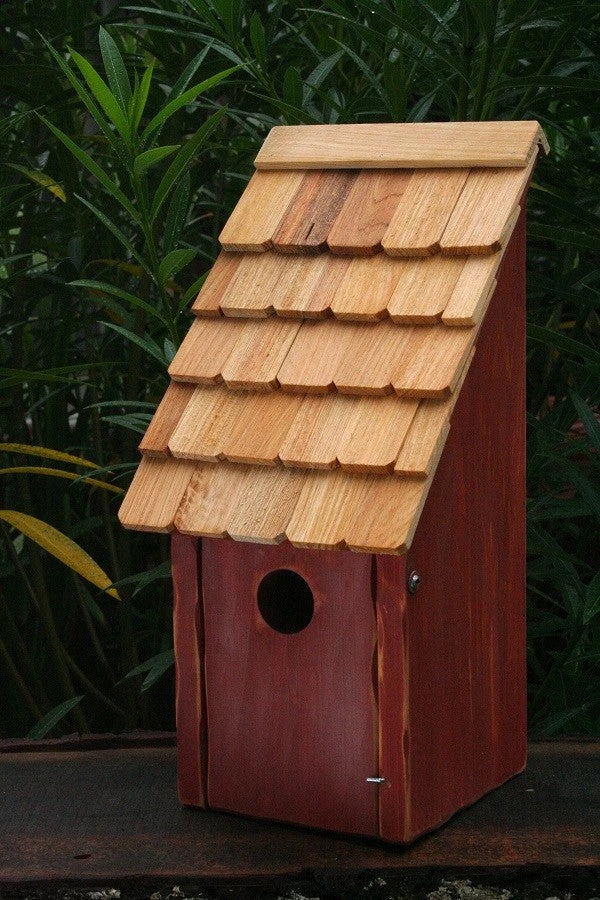 Round up a pleasing posse of America’s favorite songbirds with this classic Bluebird Bunkhouse, beautifully simple in design and ruggedly built with front opening for easy cleaning. Truly American (they range only on the American continent), bluebirds suffered a decline in the last century after the introduction of European starlings and house sparrows, larger competitors that steal bluebird nest holes. Thanks to bluebird trails and other efforts, bluebirds have made a comeback; if you’d like to be sure to prevent any rustling on your range, simply place two Bunkhouses back to back or near each other. What you’ll hear from your musical herds will be harmonious beyond compare! 1 1/2″ hole. Made in the USA!