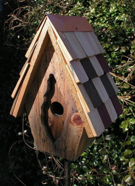 Antique Cypress nest box with recessed entrance is as natural as can be. The multi-color shingle roof contributes to the attractive look. This is a small-ish bird-house with a 1 1/4 in. hole.