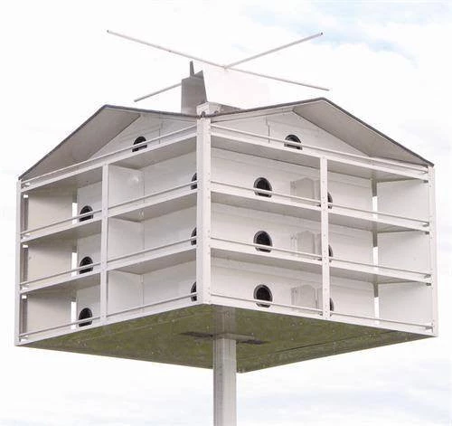 If you’re looking for the ultimate in purple martin housing look no further. The Hilltop Trendsetter 28 martin house is the “cadillac” all-in-one package built to the highest standards. Unique in design this spacious 35 square aluminum house has insulated compartment ceilings and insulated roof.  28 separate living compartments have straight entry and side entrances. Large 6 x 11 and 6 x 12 (gable compartments are 6 x 9) suites have vinyl coated wire sub-floors and ventilation that you can open and close to keep the birds comfortable. Each easily removed side panel allows nest checks of four compartments. Two 60 smooth fiberglass perch rods will add an abundance of perch space to the bottom porch. This spacious house has 5 wide rain guard porches to keep the nest dry in extreme weather conditions. Porch dividers increase occupancy and decrease porch dominance.Â