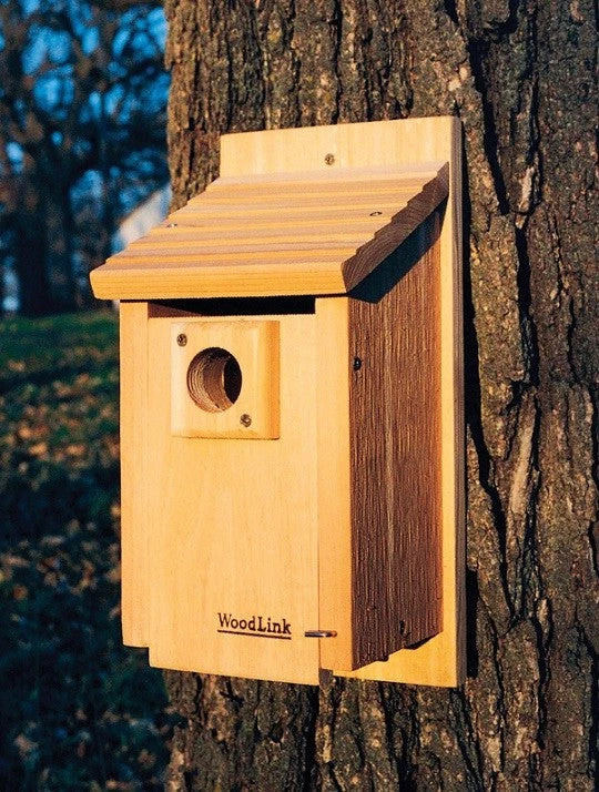 - Sloping roof and drainage holes keep it dry and ventilation slots regulate the inside temperature for fledgling comfort.